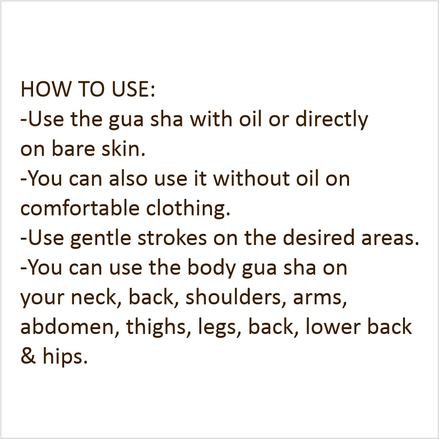 You can use the body gua sha on your neck, back, shoulders, arms, abdomen, thighs, legs, back, lower back & hips.