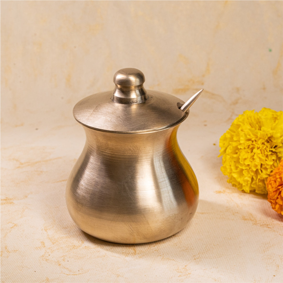Storing Ghee in a Kansa Ghee Loti has numerous health benefits. Bronze has natural antimicrobial properties that can positively impact the quality of stored ghee, preserving its nutritional value & contributing to overall health benefits such as increasing metabolism, improving immunity & reducing acidity.